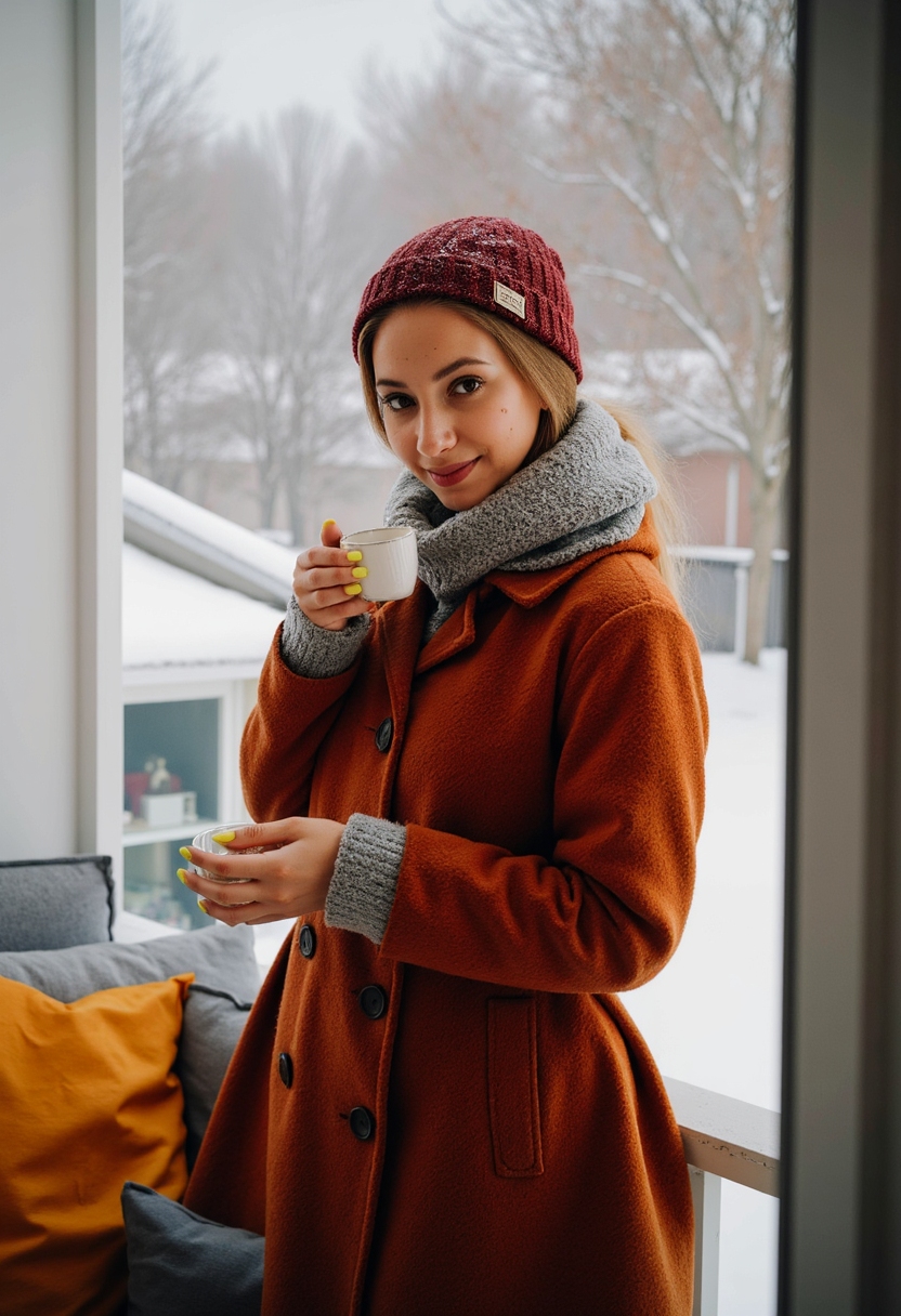 Женщина в праздничном наряде стоит на заснеженном балконе с чашкой горячего напитка, смотрит прямо в камеру